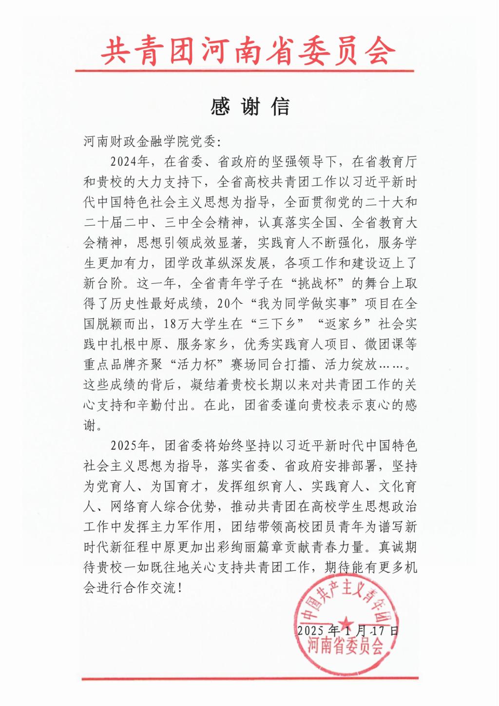 近日,共青团河南省委员会向安博·体育_安博(中国)党委发来感谢信,对安博·体育_安博(中国)长期以来高度重视共青团工作,积极落实上级部署,强化思想引领,加强实践育人,服务学生成长,推进团学改革,开展“三下乡”“返家乡”社会实践活动等,为推动2024年全省共青团工作取得优异贡献表示衷心感谢。