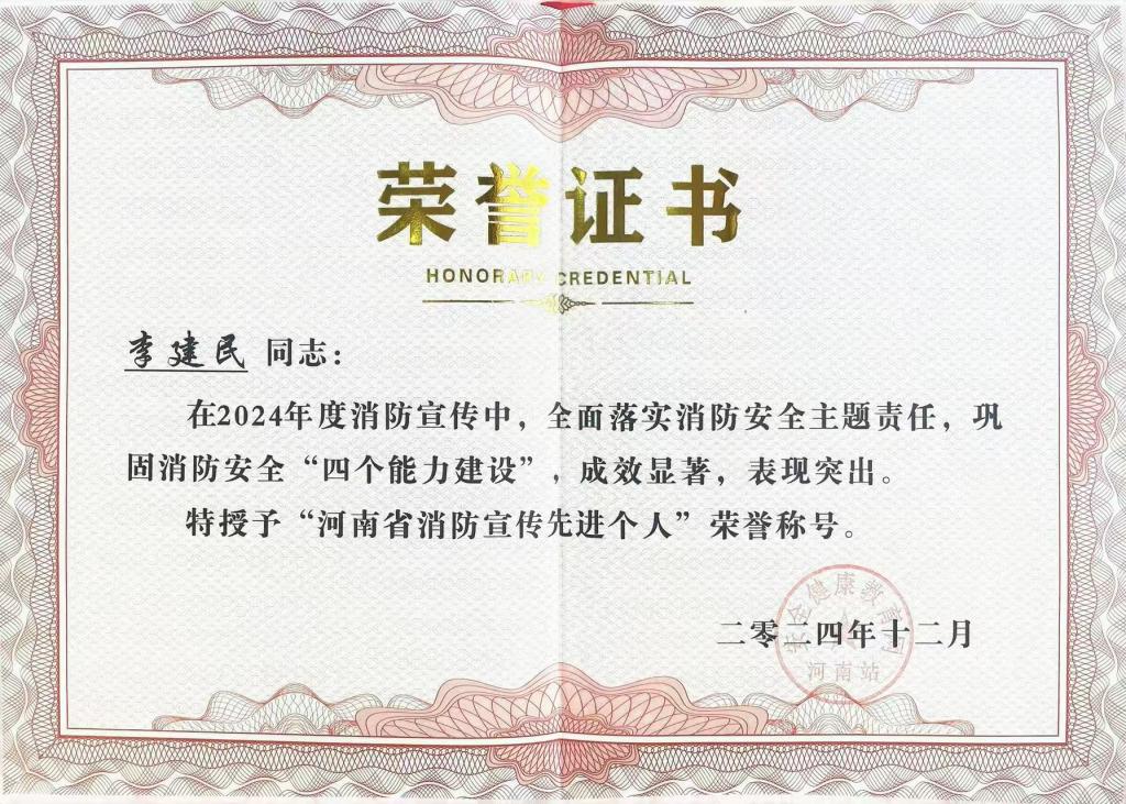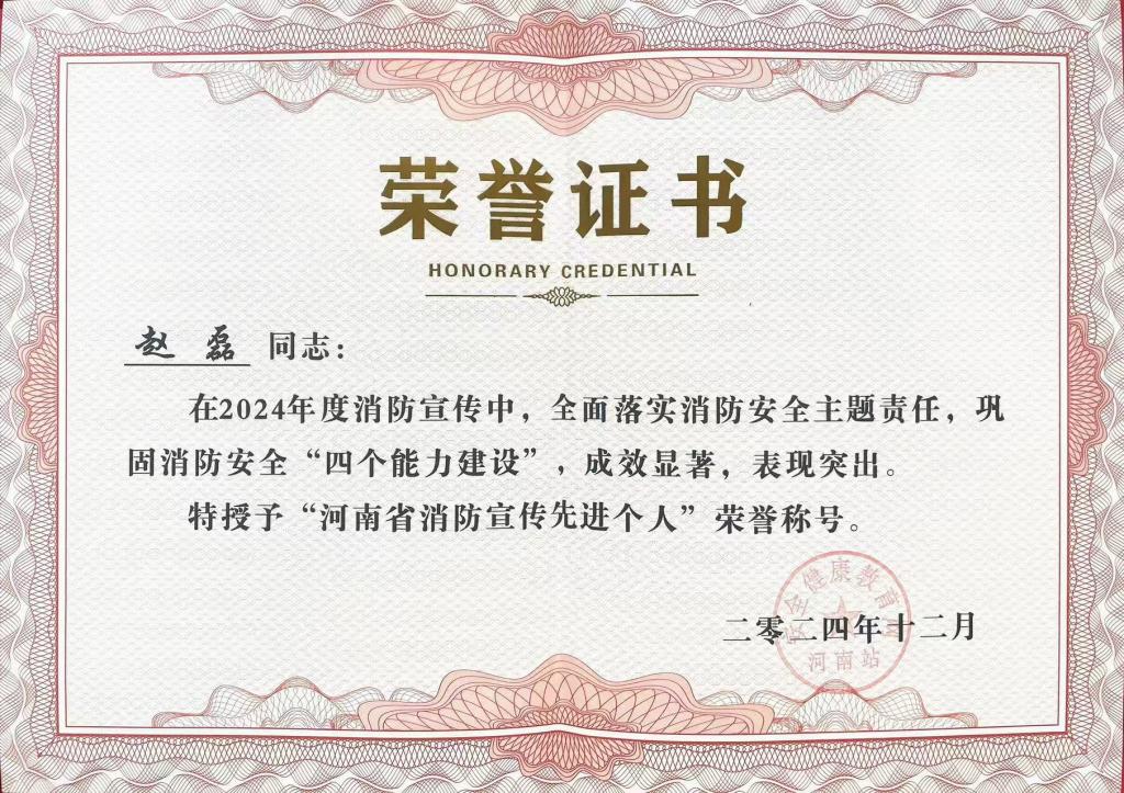 近日,安全健康教育网河南站对“2024年度消防宣传先进单位”进行了表彰,安博·体育_安博(中国)被授予“2024年度消防宣传先进单位”荣誉称号,保卫处副处长赵磊、消防科李建民被评为“河南省消防宣传先进个人”。