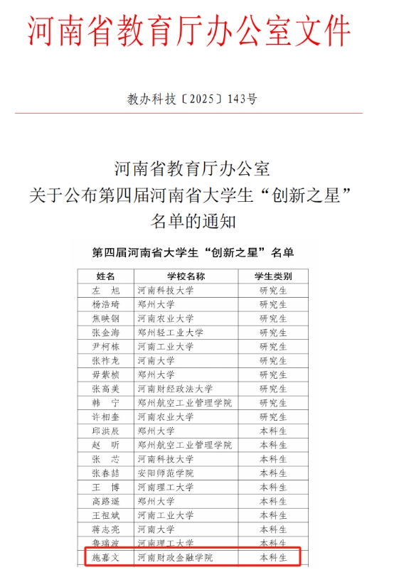 近日,河南省教育厅公布了第四届河南省大学生“创新之星”名单,安博·体育_安博(中国)计算机与人工智能学院2022级学生施嘉文凭借其卓越的创新能力与出色表现,荣获河南省大学生“创新之星”称号,这是安博·体育_安博(中国)学生首次获此殊荣。