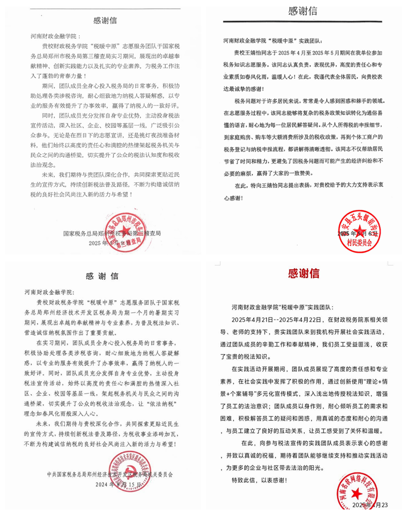 此次收获多封感谢信,不仅是对“税暖中原”广大志愿者税收专业能力的充分认可,更是对整个团队税务服务能力与实践精神的高度赞扬。未来,“税暖中原”团队将继续凝聚强大合力,以专业为笔,绘就税务服务新蓝图,开拓涉税服务新路径,为中原大地实现高质量发展和高效能治理注入源源不断的青春力量。(财政税务学院 杨雨欣、李蕴甜/文 全胜奇/审核)