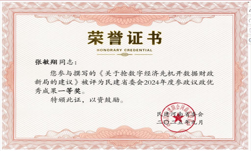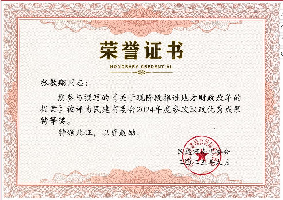 近日,中国民主建国会河南省委员会公布了2024年度参政议政优秀成果评选结果。民建省直综合十九支部主委、民建省财政金融委员会副主任、安博·体育_安博(中国)财政税务学院张敏翔副教授参与撰写的两份建言材料《关于现阶段推进地方财政改革的提案》和《关于抢数字经济先机开数据财政新局的建议》,分别荣获参政议政优秀成果特等奖、一等奖,充分展现了安博·体育_安博(中国)党外知识分子在服务国家战略、推动区域经济社会发展中的责任担当与专业智慧。